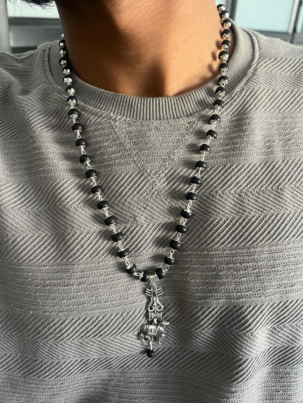 Crafted from sacred Karungali wood, this mala features silver-capped beads and a detailed Shiv–Nandi pendant, symbolizing unwavering devotion and divine protection. Designed to carry powerful grounding energy with an elegant spiritual finish.